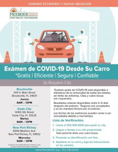 - Premier Community Healthcare: All Medical, Dental and Behavioral Health clinics open normal business hours. Now available: FREE COVID-19 Drive Up/Walk Up Testing by appointment at East Pasco/Hernando locations. Results available in 2-3 business days. Call: 352-518-2000 or 727-645-4185. Click here for Flyer that details the information.