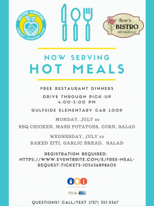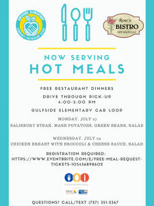 - The Community Partnership School at Gulfside Elementary with Rose's Bistro Off Main and The United Way of Pasco County: We are providing hot meals for families. Please register for the amount of meals your family needs each day. Please only register 1 meal per person in your household. Meals will be picked up on their designated day in the Gulfside Elementary Car Loop from 4 to 5 PM. No delivery available. Meals are being offered June 23 and June 25. See flyer below for menu. Please click here to register