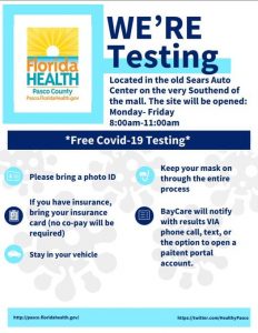 - Florida Department of Health in Pasco County: Click here for update of COVID-19 limited services.