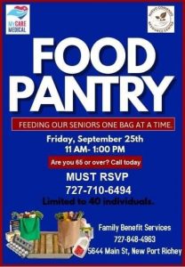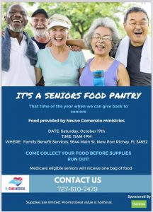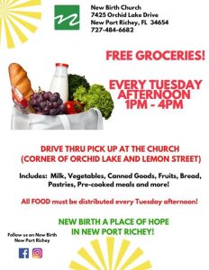 - New Birth Church: Free groceries every Tuesday afternoon from 1pm – 4pm at 7425 Orchid Lake Drive, New Port Richey.