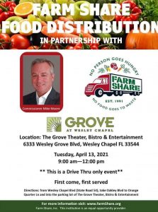 - Farm Share Food Distribution: Tuesday, April 13th from 9am – 12 pm at The Grove Theater, Bistro & Entertainment, Wesley Chapel. Drive thru event.