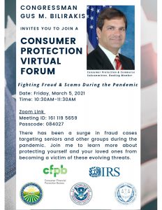 - Congressman Gus Bilirakis: Consumer Protection Virtual Forum – Fighting Fraud & Scams During the Pandemic. Friday, March 5, 2021 Time: 10:30AM-11:30AM via Zoom