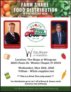 - Farm Share Food Distribution: Pasco Commission Chairman Mike Moore and Representative Randy Maggard are hosting this Farm Share Food Distribution on May 20th at 9am at The Shops at Wiregrass. This is a drive through event, people will stay in their cars for the distribution.