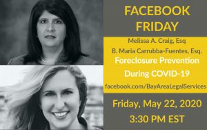 - Bay Area Legal Services: Join Melissa Craig and B. Maria Carrubba-Fuentes, of our Senior Advocacy Unit team, as they discuss foreclosure prevention during COVID-19. They will both share different protections and practical tips to keep your home. Tune in Friday, May 22, at 3:30 PM! A live Q&A will follow. Click here for the link.