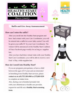 - Healthy Start Coalition Pasco County: Services are offered at a place and time convenient to the family, during COVID-19, we provide services virtually and by phone. Services include breastfeeding education, childbirth education, parenting support, smoking cessation, nutritional care, health education, access to needed resources, counseling, and safe sleep education. Our services are voluntary and at no cost. In addition, New Healthy Start participants get a chance to win an Evenflo Infant Carrier! Each week we will publicize the winning number on our Facebook Page.