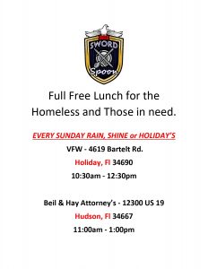 - The Sword and Spoon: Full free lunches every Sunday rain or shine for the homeless and those in need at 2 locations – Holiday and Hudson