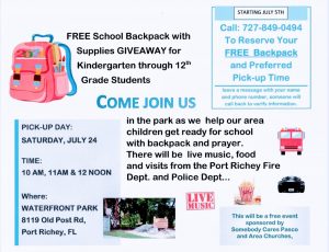 - Light Of The World Tabernacle, Church of Brotherly Love Hudson Beach Outreach and Troy Pederson: Somebody Cares BACKPACK GIVEAWAY Waterfront Park on July 24th at Port Richey Waterfront Park. Call Light Of The World Tabernacle Office at 727-849-0494. Will be accepting calls July 1, 2021. To reserve your backpack and leave a message for 10, 11 or 12 pickup times