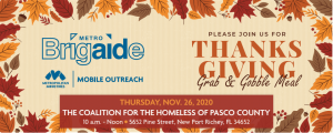 - Brigade Outreach Team:This team will be at the 5652 Pine Street, NPR location on Wednesdays from 9am – 1pm. We see anyone who walks or drives up. Our focus is to serve individuals who are literally experiencing homeless within Pasco county. We are also able to help guide any families experiencing homelessness or individuals who are housed to find other resources in the county. Our intent when working with individuals is to help them plan out the best route to ending homelessness. Services that we provide include an assessment to get individuals onto the county housing list, food stamps, SSDI application, ID assistance and directing clients to other community resources available to them. NO donations of items are accepted due to limited storage space. Instead, take them to the Metropolitan Ministries campus at 3214 US-19 N, Holiday.