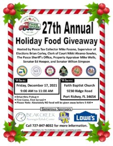- Pasco County Tax Collector Office: Our annual Farmshare food giveaway is Friday, December 17th 2021 from 9am-11am. Food is first come, first served. No food will be given away before 9am.